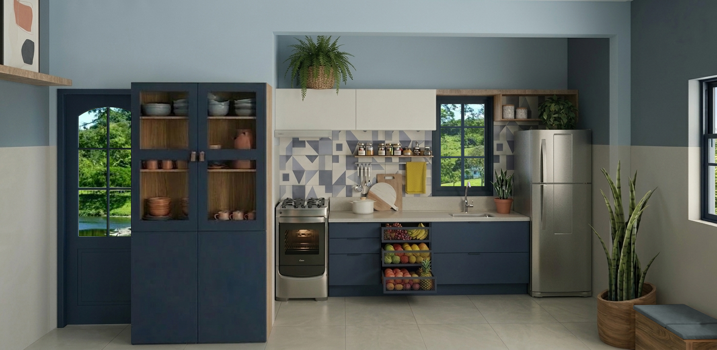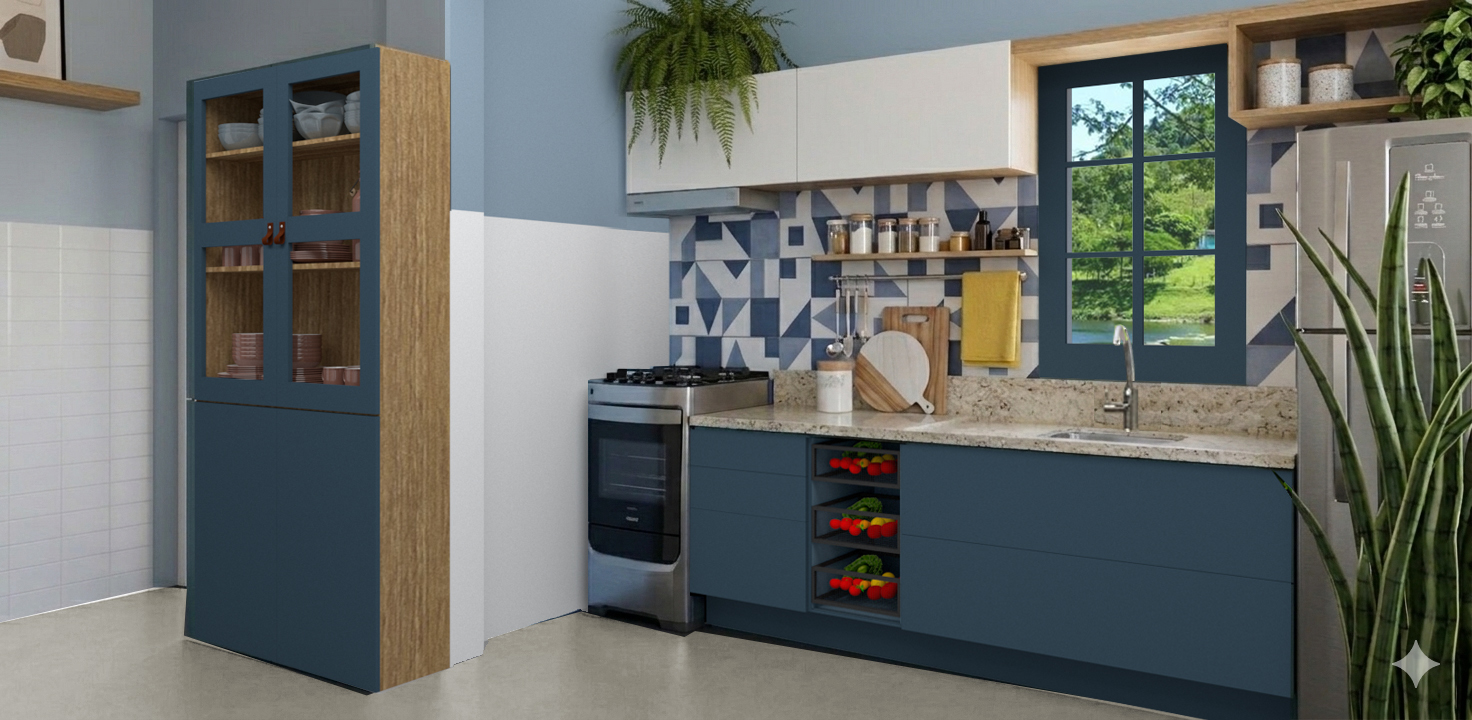 Neste projeto de reforma para esta cozinha, afim de se obter uma linguagem mais atual, foram projetados móveis sob medida. Elejeu-se o azul, cor preferida da cliente, e o amadeirado como tons predominantes. O revestimento de meia parede existente foi preservado, pois estava em ótimo estado. Já na parede onde se encontram a pia e o fogão a escolha foi por um novo revestimento, criando um estilo mais moderno para o ambiente.