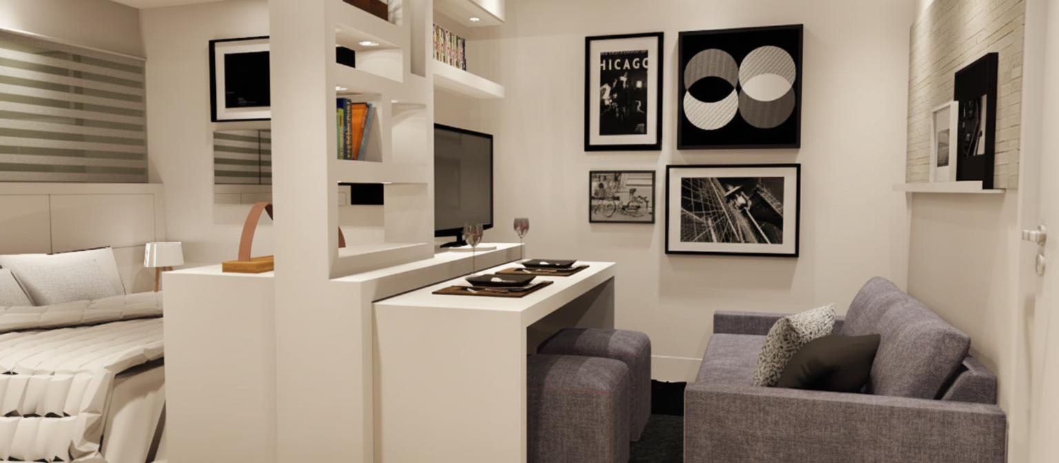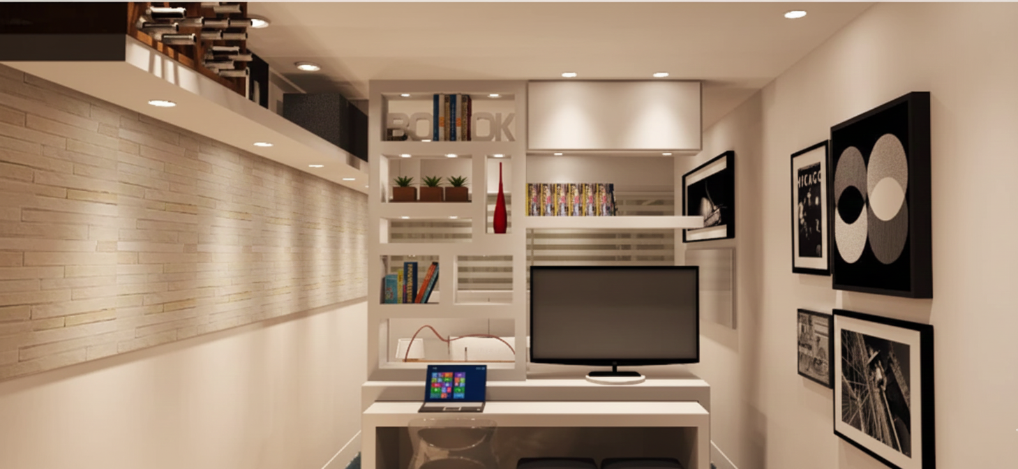 Neste projeto o design inteligente e minimalista criou um lar completo e esteticamente agradável em espaços reduzidos, atendendo plenamente às necessidades de moradia, trabalho e lazer.