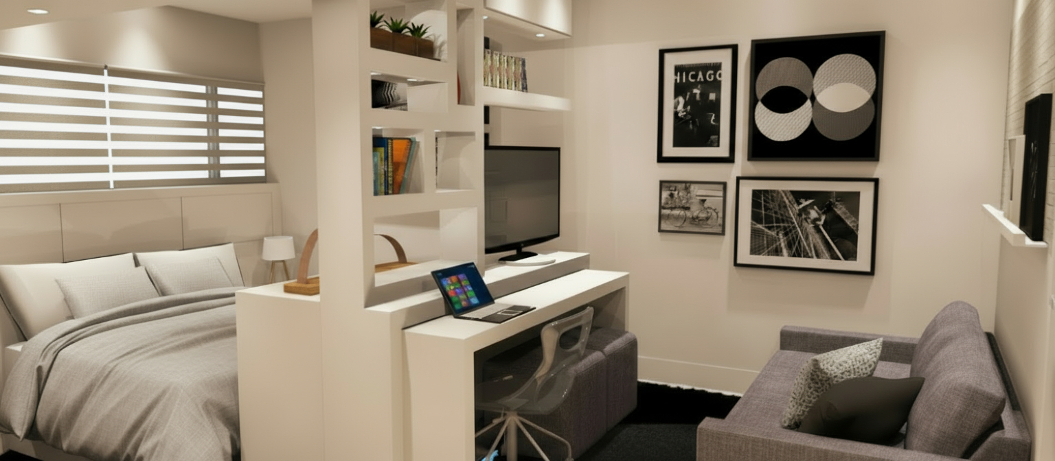 Este projeto foi desenvolvido com o objetivo de transformar um espaço compacto em um estúdio altamente funcional e esteticamente clean, maximizando cada metro quadrado. A chave do sucesso foi a criação de uma peça central de marcenaria sob medida que atua como divisor de ambientes, integrando áreas essenciais de forma elegante e inteligente.